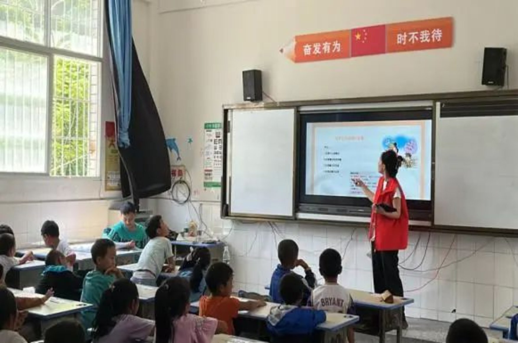 在龙潭镇中心校,当地孩子中很多都是留守儿童,安全教育成为呵护他们成长的坚实盾牌。实践团主要从“防拐、防骗、防毒、防艾滋” 以及“交通安全”和“信息网络安全”几个方面给孩子们进行讲解。队员通过生动形象的话语、风趣幽默的图片、代入式的情景剧,带领孩子们沉浸课堂,真实地感受“骗子们”高超的诱拐手段,为同学们打下了安全预防第一针。孩子们也积极踊跃地参与课堂演练的互动环节,这份热情深深地打动了实践团的队员们,让大家更有信心和决心上好在这里的每一堂课。